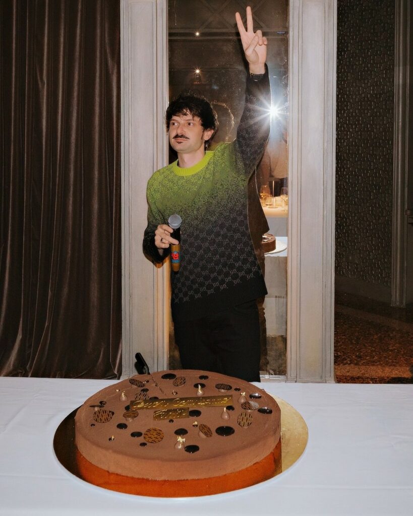 Fabio è casual, con indosso un particolare maglione che sfuma dal verde scuro a quello acido. Accanto a lui la fidanzata Lucia Pizzuto, a cui è legato da quasi 4 anni. Cracco, con indosso la divisa da cuoco, è lì anche nel momento della gigantesca torta al cioccolato, quello in cui tutti gli intonano il classico “tanti auguri a te”.