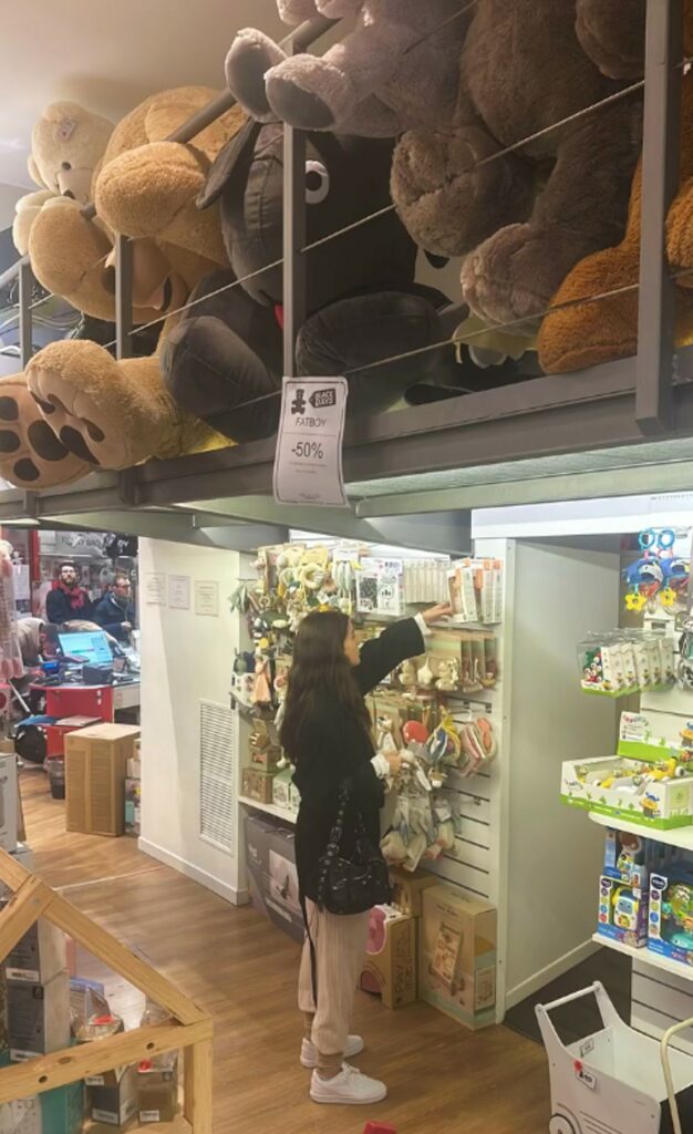 Fabrizio tiene così in mano una giraffa di gomma con tanto di sonaglietto interno e la strizza di continuo, facendola suonare rumorosa. E’ solo uno dei tanti piccoli pensieri per il figlioletto. Le buste si riempiono in fretta, Sara ne è contenta, così poi si torna a casa.