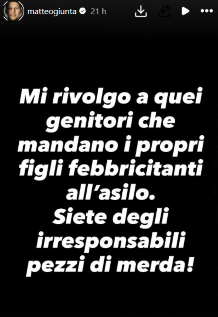 Giunta non va molto per il sottile: è lui a rendere evidente quel che è accaduto. “Mi rivolgo a quei genitori che mandano i propri figli febbricitanti all’asilo. Siete degli irresponsabili pezzi di mer*a!”, fa sapere.
