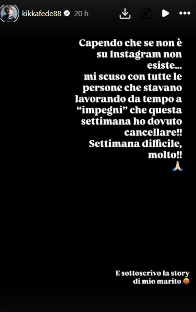 - “Settimana difficile, molto! E sottoscrivo la story di mio marito”, spiega su Instagram
