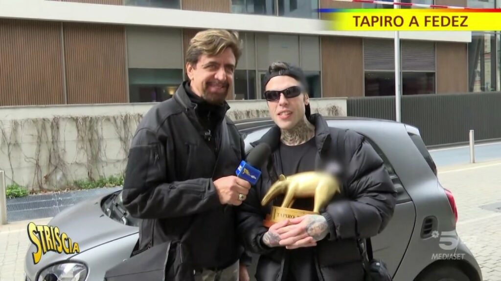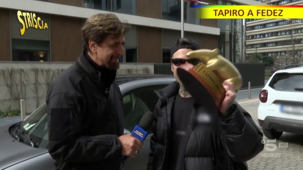 Valerio Staffelli è ancora una volta sulle sue tracce. Fedez riceve un altro Tapiro d’Oro da Striscia la Notizia. Stavolta la causa è la chiusura del podcast Muschio Selvaggio, dopo che il tribunale ha dato ragione a Luis Sal, il suo ex socio. Il rapper, però, ai microfoni del tg satirico di Antonio Ricci, parla anche del presunto bacio con un’altra a Parigi, durante la Fashion Week. Il 34enne replica: “Non voglio fare la lotta nel fango”. Non desidera aggiungere altro sul gossip.
