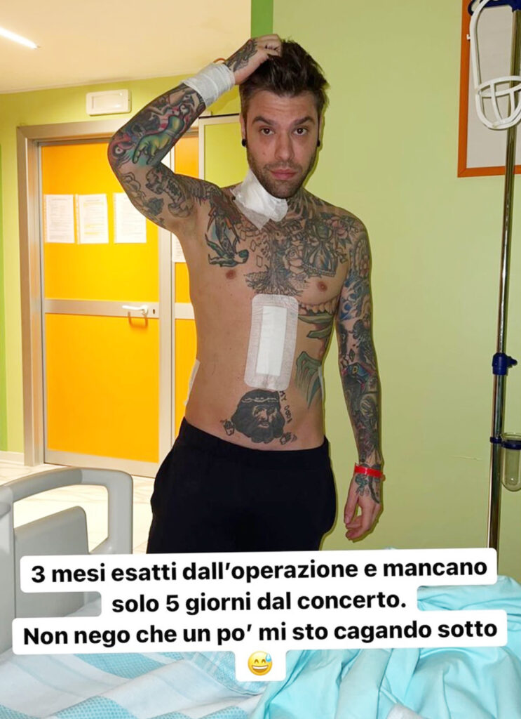 Il rapper 32enne è stato operato lo scorso 22 marzo al San Raffaele di Milano, con un intervento durato ben 6 ore gli è stato rimosso un raro tumore neuroendocrino al pancreas. Fedez condivide nelle sue IG Stories uno scatto fatto dopo essersi ripreso dall’anestesia in ospedale, ha un grosso cerotto sull’addome. “Tre mesi esatti dall’operazione e mancano solo 5 giorni dal concerto. Non nego che un po’ mi sto cagan*o sotto”, rivela.