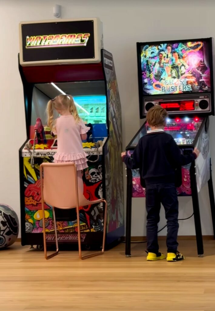Non è tutto. Federico Lucia nell’enorme stanza col pavimento ricoperto di parquet e le vetrate che regalano una bella vista sui tetti del capoluogo lombardo, ha piazzato anche un flipper e un videogioco vintage, di quelli che attraevano tanti ragazzi in sala giochi. I figli non possono che esserne felici e senza farsi pregare ci vanno a giocare.