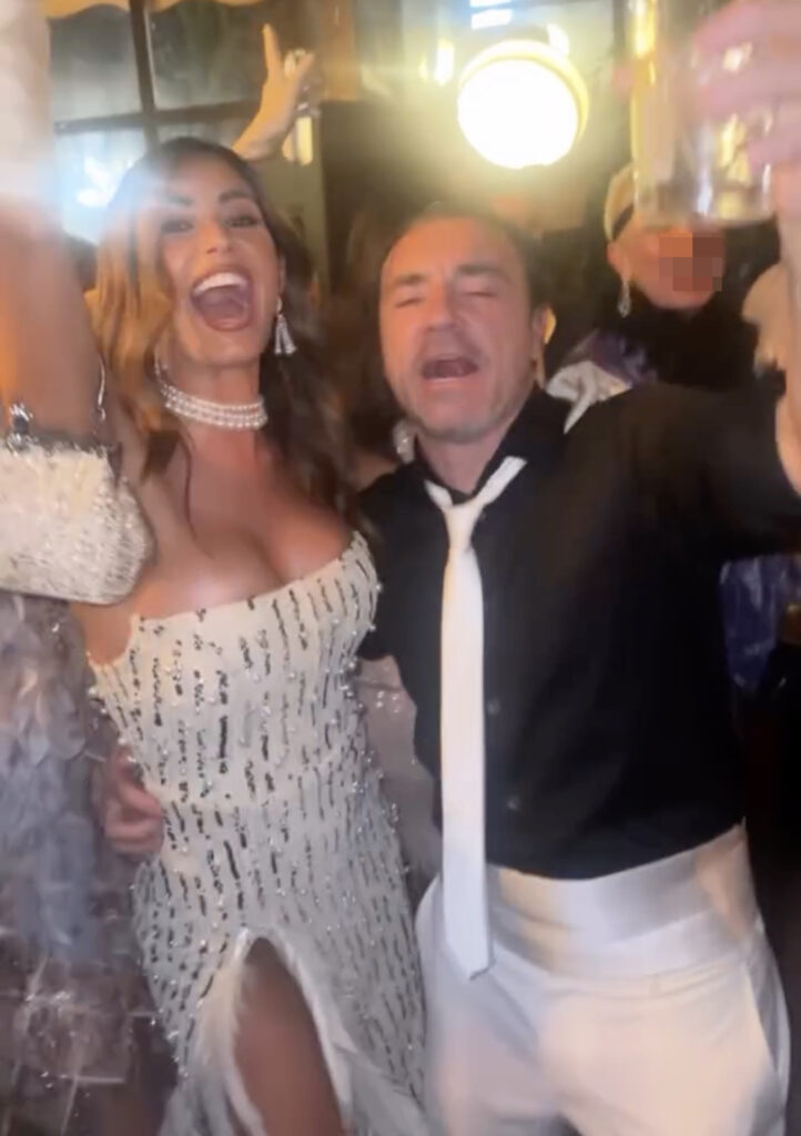 Nargi ha scelto un abito bustier scintillante con spacco vertiginoso e dettagli in piume. Matri un completo grigio gessato con coppola, richiamando un'eleganza vintage impeccabile per l’occasione.