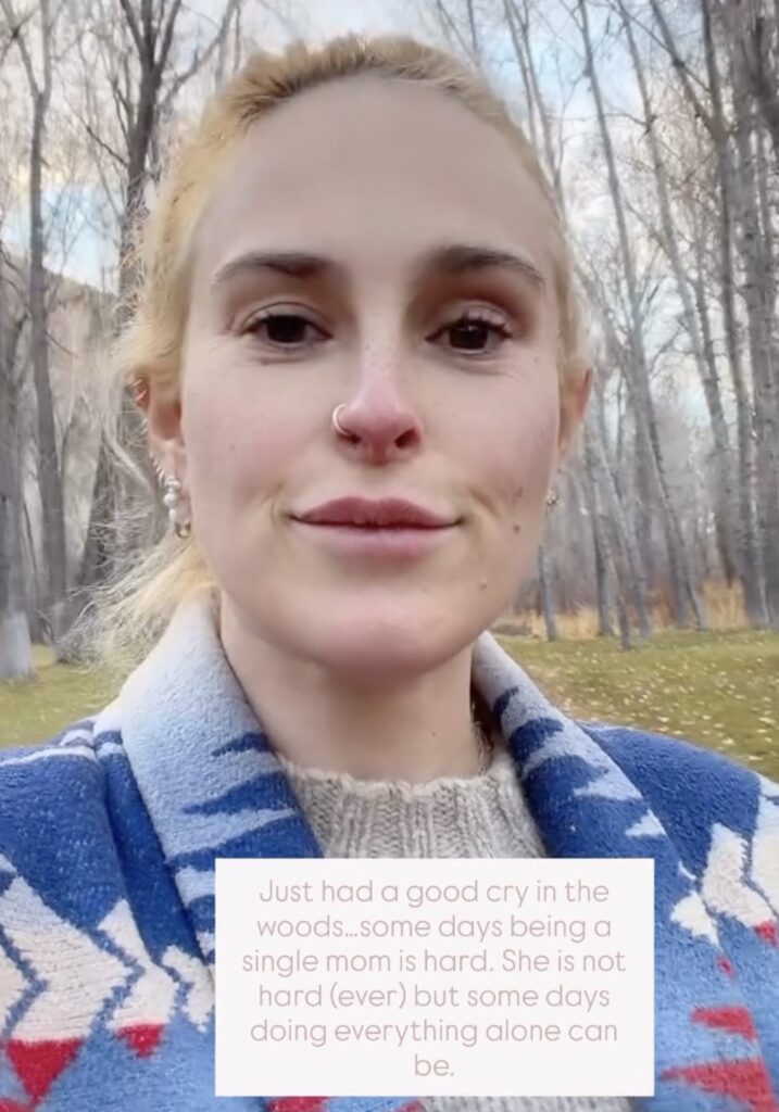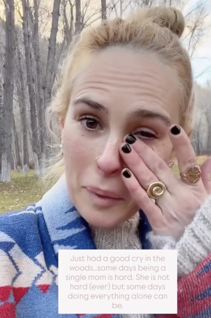 In una Instagram Story ha condiviso un momento di forte vulnerabilità e ha mostrato anche gli occhi carichi di lacrime: “Ho appena fatto un bel pianto nel bosco… alcuni giorni essere una mamma single è difficile. Lei (la bambina, ndr) non è difficile (mai) ma alcuni giorni fare tutto da sola può esserlo”.