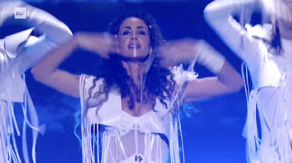 Durante la performance è stata più volte inquadrata dalle telecamere con indosso un costume bianco con frange e un body strutturato. Il look era completato da un trucco scenico con elementi decorativi bianchi sul viso, accentuato da bracciali e dettagli piumati.