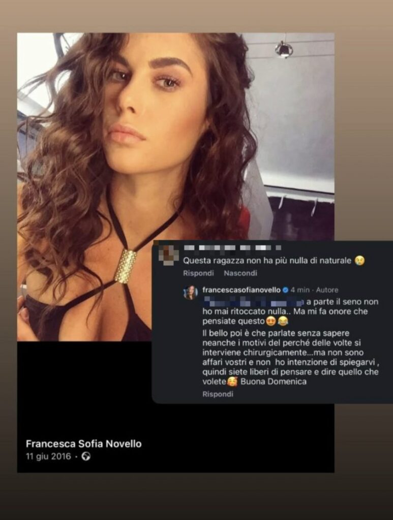 I maligni sono impietosi: “Eri molto più bella. Ora sei come tutte le altre, piena di chirurgia”. E ancora: “Questa ragazza non ha più nulla di naturale”. Francesca Sofia replica e svela l’unica parte del corpo sulla quale è intervenuta con la chirurgia plastica: “A parte il seno non ho mai ritoccato nulla… Ma mi fa onore pensiate questo”. Aggiunge una faccina che ride a crepapelle.