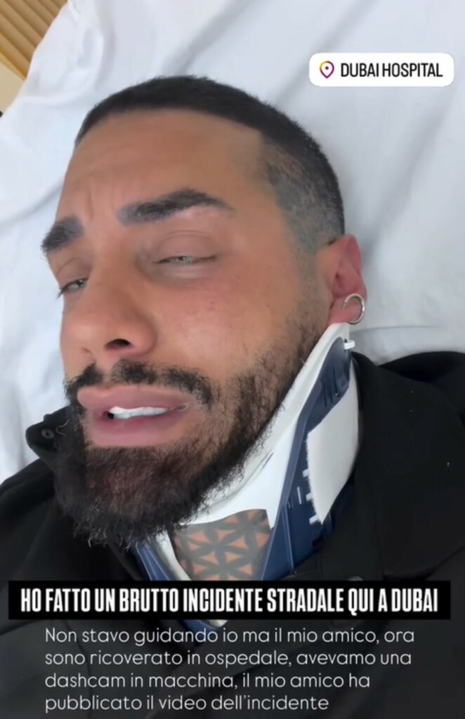 L’ex volto di Temptation Island, soprannominato Lenticchio, viene portato via in barella e trasportato al Dubai Hospital per il ricovero: ha un collare che gli blocca il collo. “Ho fatto un brutto incidente qui - scrive - Non stavo guidando io, ma il mio amico. Ora sono ricoverato in ospedale. Avevamo una dashcam in macchina, il mio amico ha pubblicato il video dell’incidente”.
