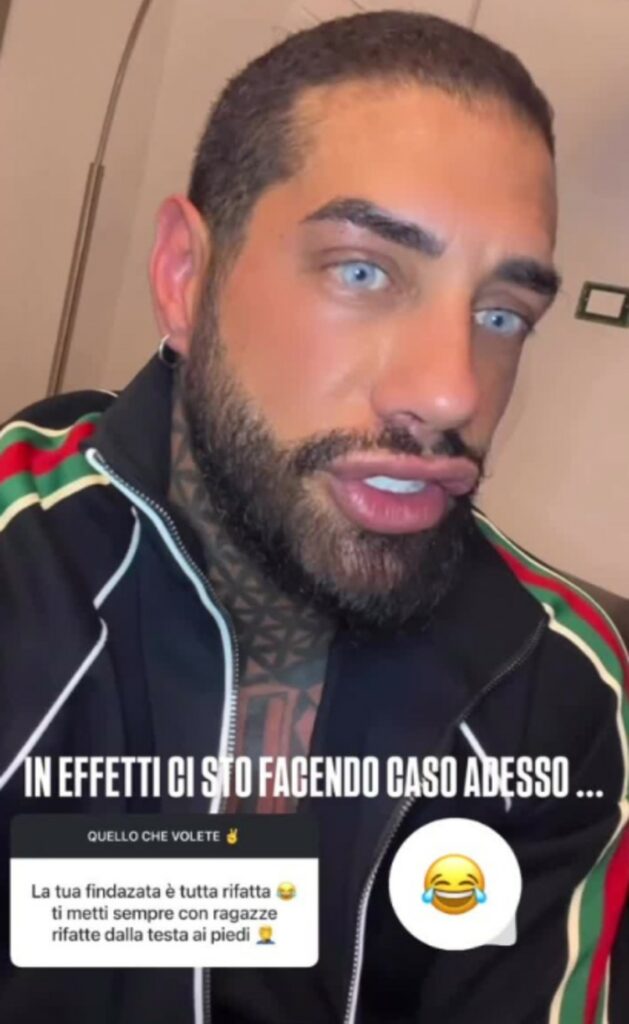 Ora ha al suo fianco Manuela Carriero, 35 anni, ex tronista di Uomini e Donne ed ex di Temptation Island. Un follower gli scrive: “La tua fidanzata è tutta rifatta: ti metti sempre con ragazze rifatte dalla testa ai piedi”. Il romano 36enne ci scherza su. “In effetti ci sto facendo caso adesso”, sottolinea.