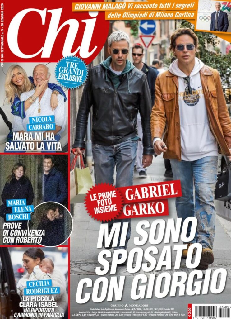 Ha svelato i fiori d’arancio, celebrati due anni fa in gran segreto, in tv. A Verissimo ha persino mostrato l’anello e chiarito: “Sono due anelli, uno di fidanzamento e uno di matrimonio”. Gabriel Garko e il marito Giorgio sono stati paparazzati in strada a Roma, Chi pubblica in copertina le prime foto della coppia, mentre cammina serenamente, nonostante gli obiettivi dei fotografi.