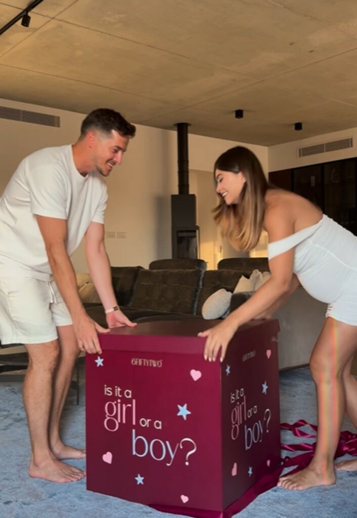 Emma indossa un abitino drappeggiato bianco che mette in mostra il pancione, anche il fidanzato ha t-shirt e bermuda dello stesso colore. Davanti a loro c’è una grande scatola con su scritto “Is it a girl or a boy?". Quando la Muscat apre il coperchio, escono tantissimi palloncini rosa: i due avranno una bimba.