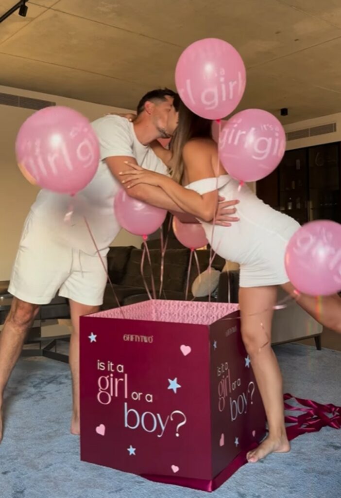 Emma indossa un abitino drappeggiato bianco che mette in mostra il pancione, anche il fidanzato ha t-shirt e bermuda dello stesso colore. Davanti a loro c’è una grande scatola con su scritto “Is it a girl or a boy?". Quando la Muscat apre il coperchio, escono tantissimi palloncini rosa: i due avranno una bimba.