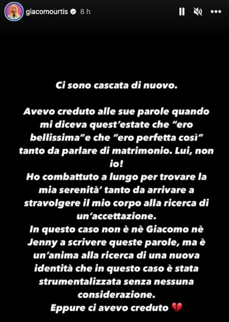 Giacomo rimane con l’amaro in bocca. Sul social si sfoga e pubblica una storia in cui svela come si senta ora. “Ci sono cascata di nuovo. Avevo creduto alle sue parole quando mi diceva quest'estate che ‘ero bellissima’ e che ‘ero perfetta così’, tanto da parlare di matrimonio. Lui, non io! Ho combattuto a lungo per trovare la mia serenità, tanto da arrivare a stravolgere il mio corpo alla ricerca di un'accettazione. In questo caso non è né Giacomo, né Jenny a scrivere queste parole, ma è un'anima alla ricerca di una nuova identità che in questo caso è stata strumentalizzata senza alcuna considerazione. Eppure ci avevo creduto”, fa sapere.