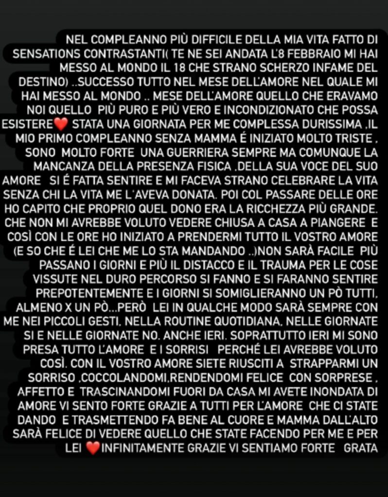“Nel compleanno più difficile della mia vita, fatto di sensazioni contrastanti, te ne sei andata l’8 febbraio e mi hai messo al mondo il 18. che strano, quasi crudele, scherzo del destino.