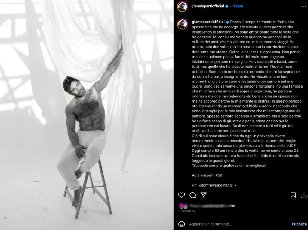 “Passa il tempo, talmente in fretta che spesso non me ne accorgo. Ho vissuto questo pezzo di vita inseguendo le emozioni. Mi sono emozionato tutte le volte che ho danzato. Mi sono emozionato quando ho conosciuto le culture dei posti che ho visitato nei miei numerosi viaggi. Ho amato, solo due volte, ma, ho amato con la convinzione di aver dato tutto me stesso. Cerco la bellezza in ogni cosa. Non penso mai che qualcuno possa farmi del male, sono ingenuo inizialmente, poi però mi sveglio”, esordisce Sperti nel post.