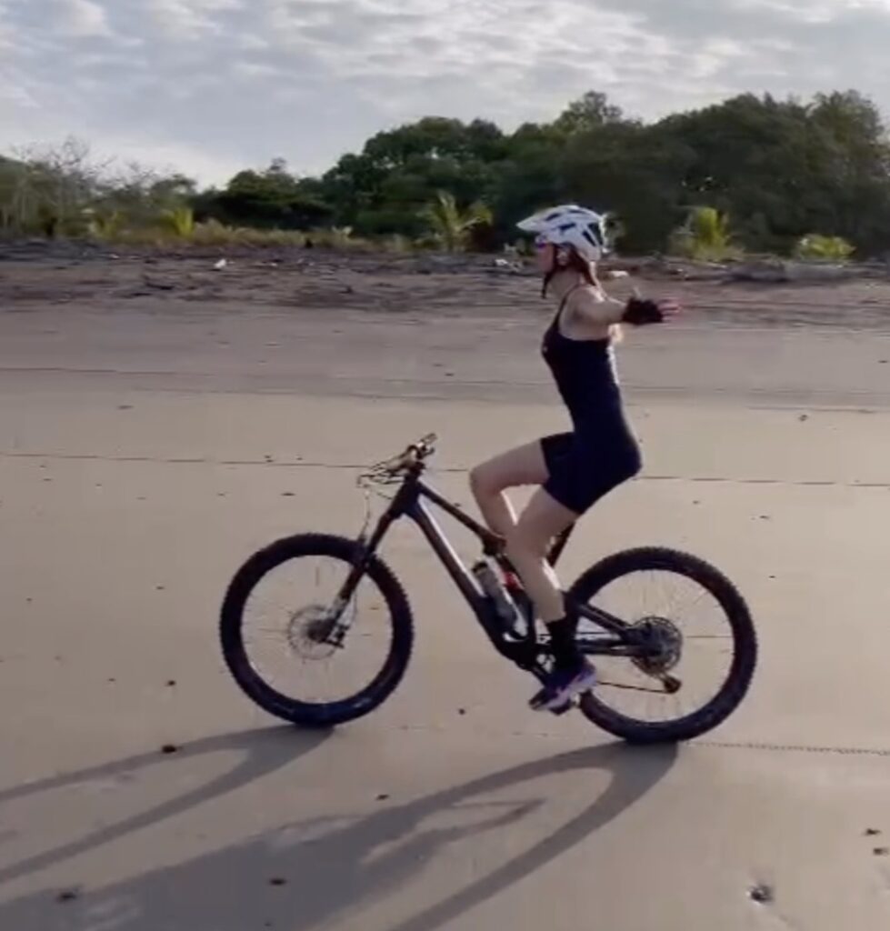 Braccia aperte per bilanciarsi o per godersi il momento: andare in bici in mezzo alla natura è un eccellente esercizio a basso impatto che migliora la salute cardiovascolare e rafforza i muscoli delle gambe. Praticarlo all'aperto offre benefici per il benessere mentale e riduce lo stress. È un ottimo modo per aumentare la resistenza e l'energia, mantenendo le articolazioni sane.