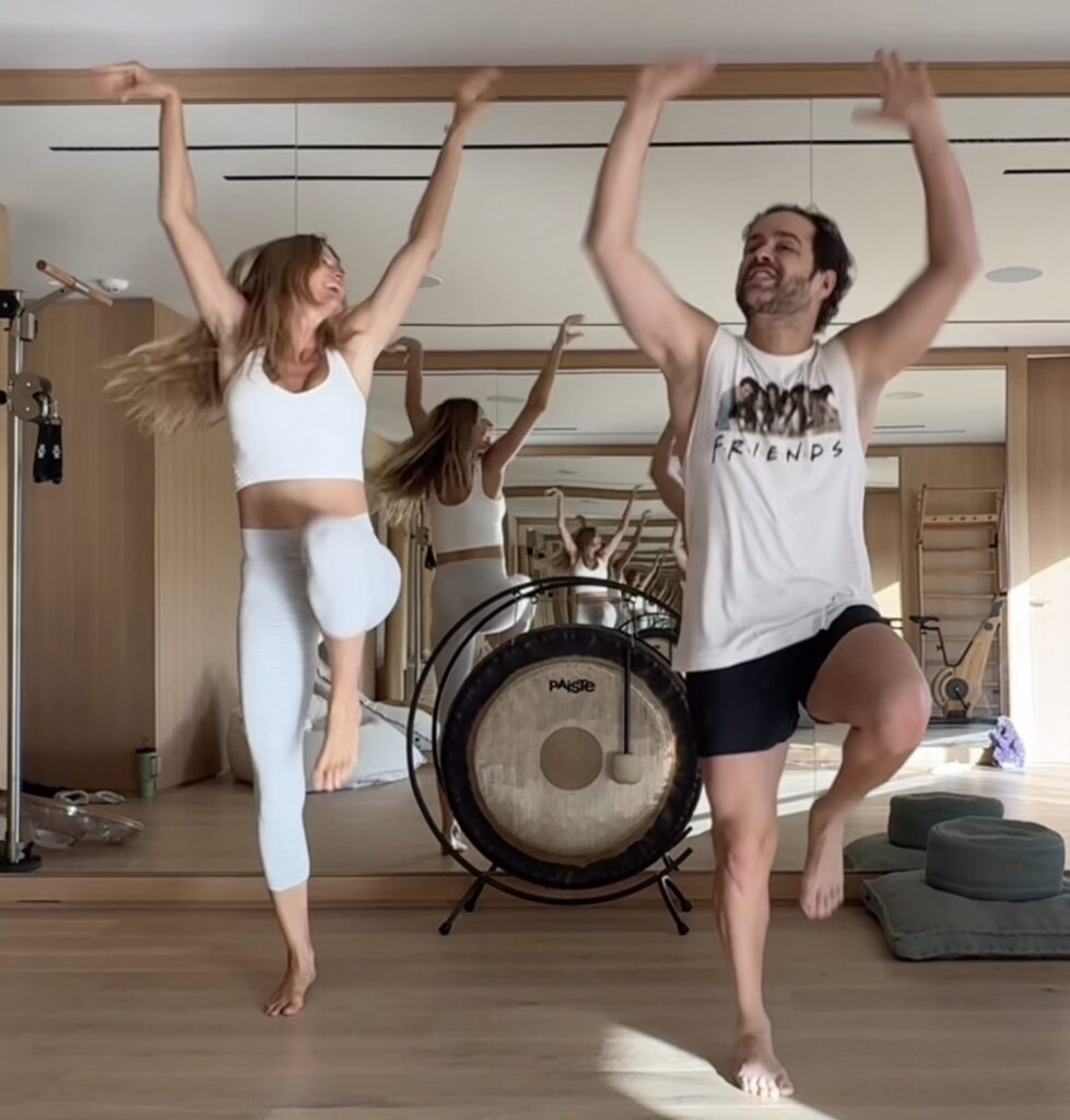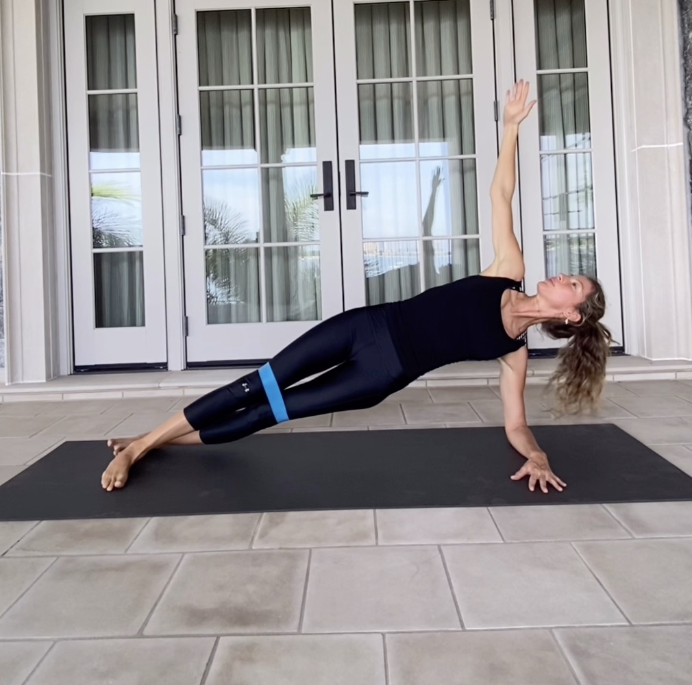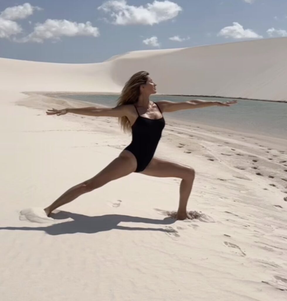 Qui Gisele esegue un plank laterale, un esercizio di pilates o core training. Questo movimento rinforza i muscoli addominali obliqui, le spalle e i glutei, migliorando anche l’equilibrio e la stabilità. È un esercizio ideale da fare a casa per tonificare e mantenere una buona postura. Aiuta inoltre a prevenire dolori lombari e a sviluppare una maggiore consapevolezza corporea.