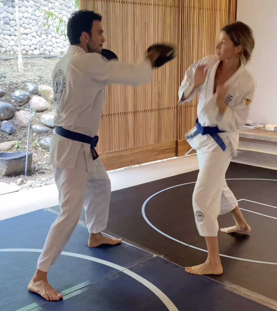 Qui la supermodel sembra allenarsi con il compagno – padre del suo ultimo figlio – Joaquim Valente. Praticano insieme jiu-jitsu (lui lo insegna di professione) vestiti con kimono e cintura blu. Questo sport allena forza, concentrazione e riflessi, migliorando la coordinazione e l’autocontrollo. Allenarsi regolarmente aiuta a tonificare tutto il corpo, potenziare la resistenza e ridurre lo stress, favorendo equilibrio fisico e mentale.