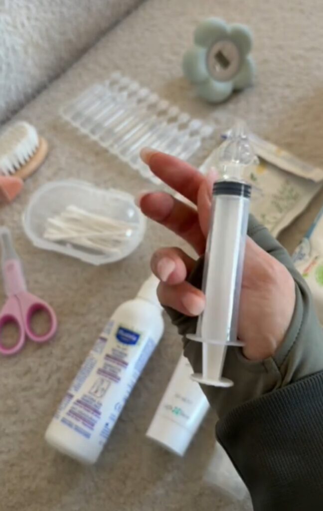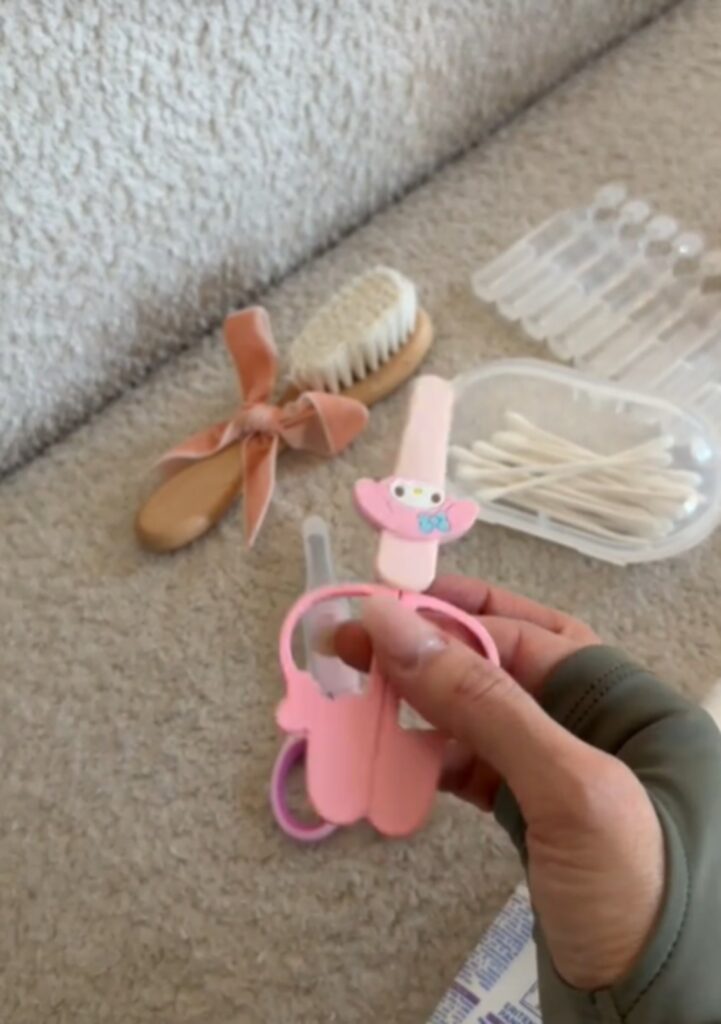 Nel beauty ci sono due forbicette: una per le unghie della bambina e l’altra “per le etichette dei body, dei vestitini, a me danno molto fastidio e quindi cerco di non tenerle mai sui vestiti”. Presente una spazzolina, una scatolina con dei cotton fioc, soluzione fisiologica per lavaggi nasali . Ci sono anche un termometro per misurare la temperatura dell’acqua e salviettine umidificate. “Per ultimo, ma non per importanza, se viaggiate con un neonato per ogni tipo di superficie, io vi consiglio questo spray igienizzante che ho scoperto in ospedale e che non ho mai più abbandonato”, chiarisce ancora Giulia.