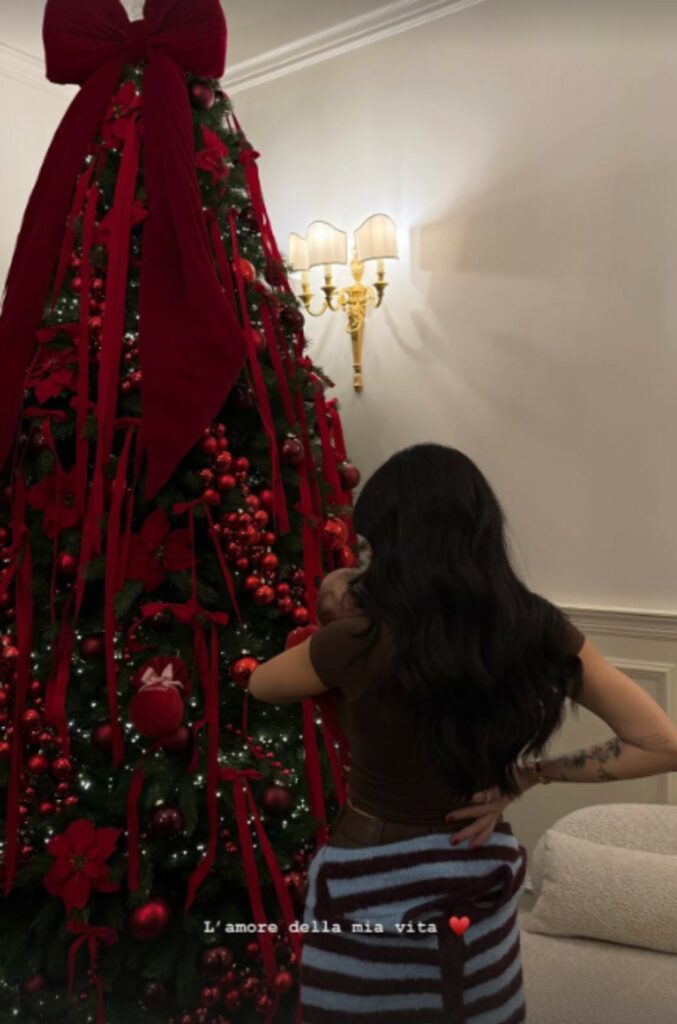 Non rinuncia agli impegni di lavoro che la vedono sul red carpet in splendida forma. Giulia De Lellis, però, cerca di trascorrere gran parte della sua giornata accanto alla piccola che ha messo al mondo il 7 ottobre scorso. E’ euforica per il primo Natale della figlia Priscilla. Sul social pubblica un reel in cui tiene la bimba avuta da Tony Effe tra le braccia davanti all’albero addobbato di rosso e scrive: “Il suo primo ed unico Natale con questi piedini quiii”.