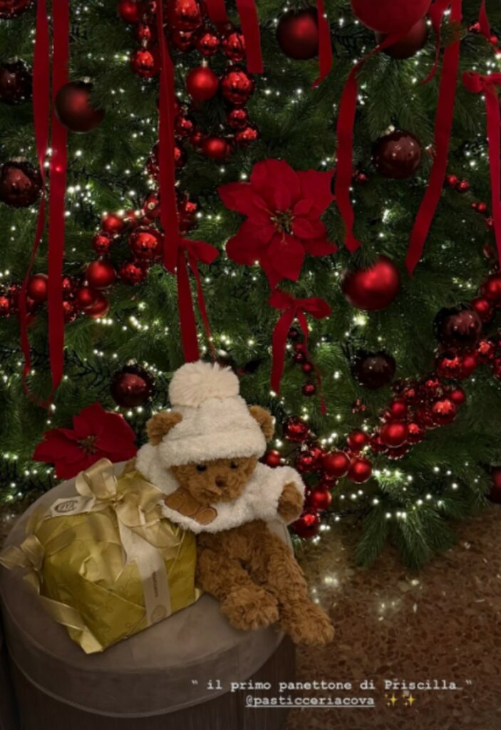 Come sempre l’influencer romana nella sua nuova casa milanese che divive con il rapper a cui è legata ha pensato proprio a tutto: sotto l’albero c’è anche un panettone dedicato a Priscilla.