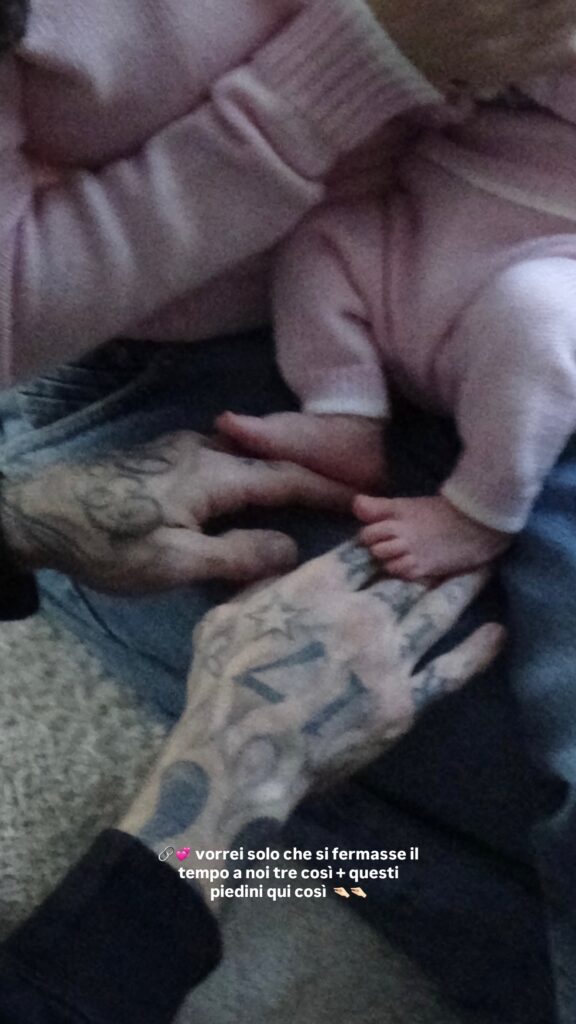 “Vorrei solo che si fermasse il tempo a noi tre così, più questi piedini qui così”, aggiunge vicino a un’altra immagine in cui ci sono le tenerissime estremità di Priscilla.
