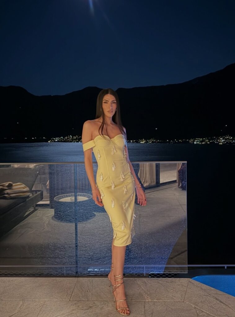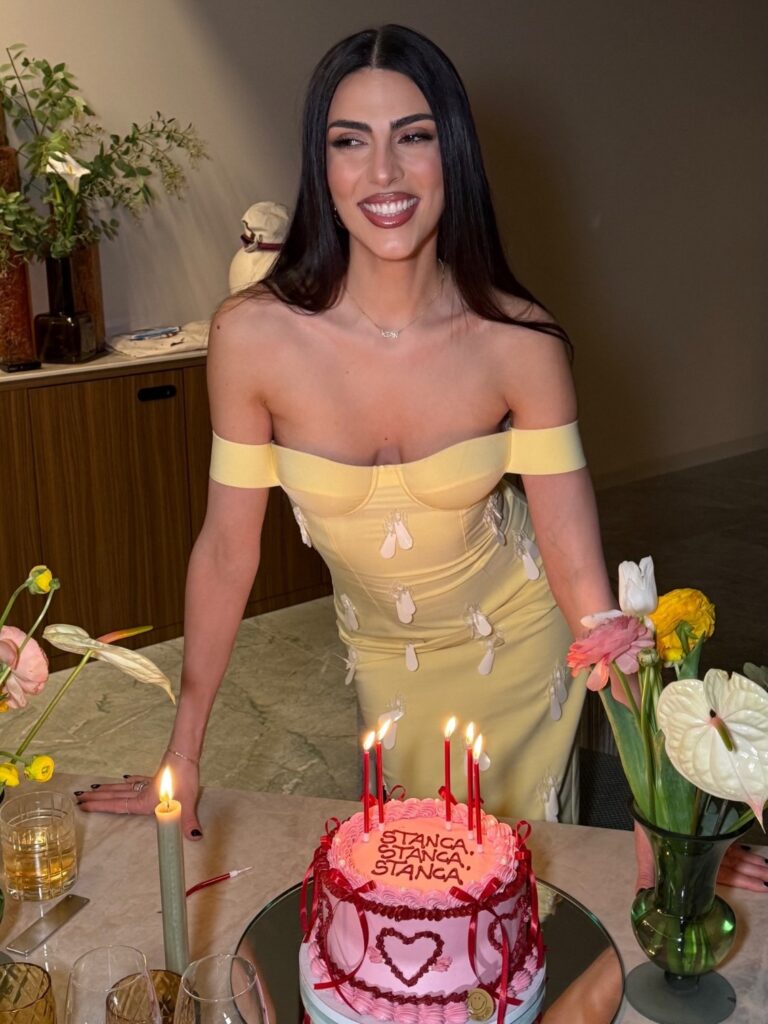 Indossa un abito longuette fasciante giallo pastello di Des_Phemmes: il vestito mostra il suo corpo perfetto e le lascia scoperte le spalle. Capelli rigorosamente lisci, portati con la riga in mezzo, e trucco impeccabile. Giulia Salemi festeggia 33 anni, spegne le candeline su una torta tutta rosa, con sopra cuori rossi e un’insolita scritta: “Stanca, stanca, stanca”. Sul social svela tutto pubblicando un carosello di foto: al party invita gli amici ex gieffini.