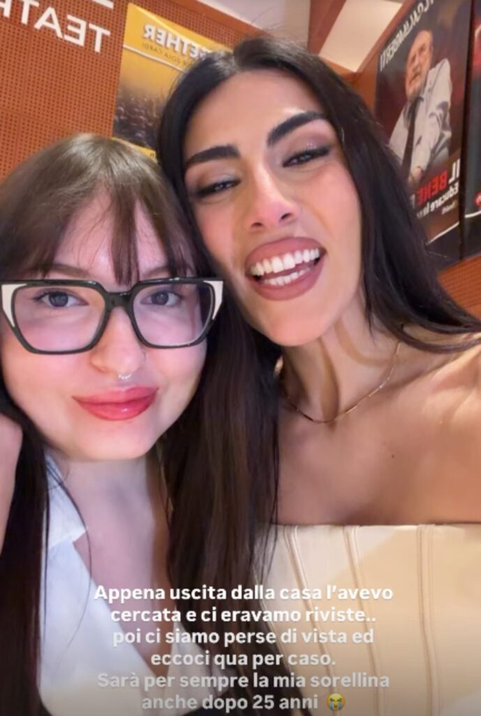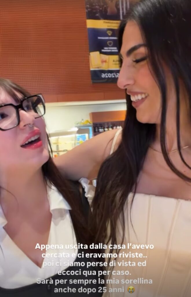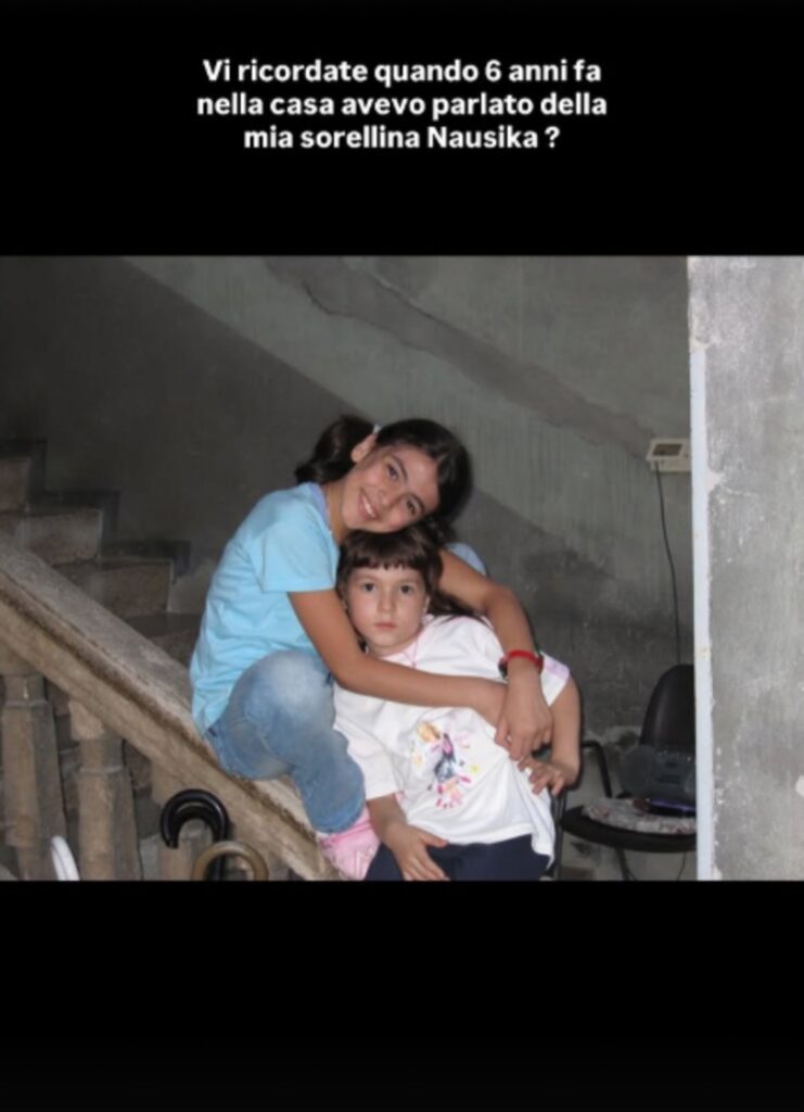 La Salemi lascia tutti a bocca aperta. Nelle Storie pubblica una foto che la ritrae bambina con la sorella: “Vi ricordate quando 6 anni fa nella Casa avevo parlato della mia sorellina Nausika?”. Poi si fa vedere vicino a lei: “Sono felicissima. Appena uscita dalla Casa l’avevo cercata e ci eravamo riviste. Poi ci siamo perse ed eccoci qua per caso. Sarà per sempre la mia sorellina dopo 25 anni”. “C’è da dire che non sono così ‘nana’, lei ha i tacchi”, replica Nausika ironica.