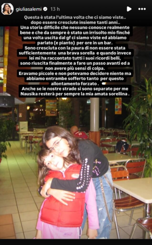 Giulia poi condivide un’altra foto con Nausika e spiega: “Sono cresciuta con la paura di non essere stata sufficientemente una brava sorella e quando invece lei mi ha raccontato tutti i suoi ricordi belli, sono riuscita finalmente a fare un passo avanti e a non avere più sensi di colpa”. Nonostante le loro strade si siano separate, lei la porta nel cuore.