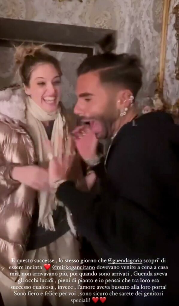 “E questo successe. Lo stesso giorno che Guenda scoprì di essere incinta - racconta - lei e Mirko dovevano venire a cena a casa mia. Non arrivavano più, poi, quando sono arrivati, Guenda aveva gli occhi lucidi, pieni di pianto. Pensai che tra loro era successo qualcosa, invece l’amore aveva bussato alla loro porta! Sono fiero e felice per voi, sono sicuro che sarete genitori speciali!”.