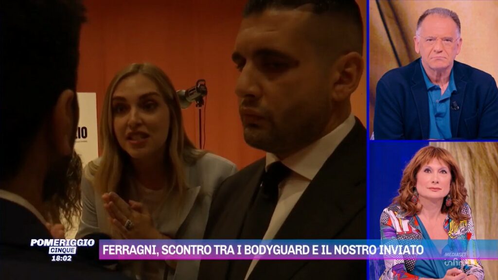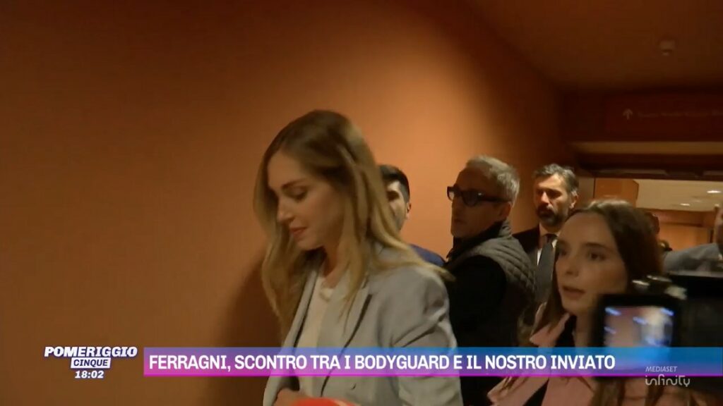 A Roma, all’evento organizzato dal Codacons insieme a lei presenta il progetto “Oltre il Silenzio” contro la violenza sulle donne e l’omotransfobia. All’Auditorium Pardo della Musica è scortata, inavvicinabile quasi. Chiara procede dritta, ma i giornalisti sono lì per porle dei quesiti. Michel Dessì prova a fermarla, ma trova davanti un muro. L’inviato di Pomeriggio 5 viene strattonato dai bodyguard della Ferragni. Alla fine la 38enne cede infastidita e si ferma. Il programma di Canale 5 trasmette l’intera scena che la riguarda. Myrta Merlino è basita e sbotta in studio: “Sceneggiata per due domande!”.