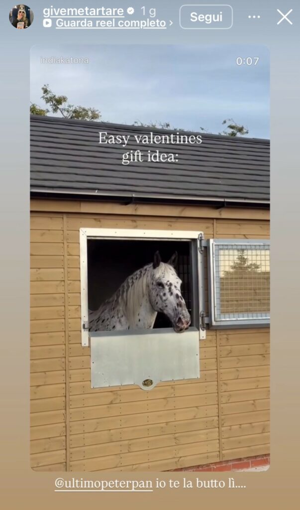 A dimostrarlo è la storia che la Di Giacomo ha postato relativa a San Valentino, la festa degli innamorati che si celebra ogni anno il 14 febbraio. U breve video con un cavallo, animale molto amato dall’influencer, accompagnato dalla scritta “semplice idea regalo per San Valentino”. “Io te la butto lì”, ha scritto Jacqueline taggando Ultimo.