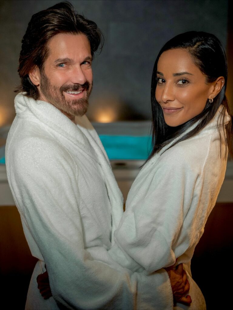 La coppia, sposata dal 2017, ma insieme dal 2007, ha lasciato a casa i due pargoli. Juliana ed Edoardo sono genitori entusiasti di Lua Sophie, 14 anni, e Sol Gabriel 9. Si rilassano totalmente con indosso solo il costume da bagno e l’accappatoio.