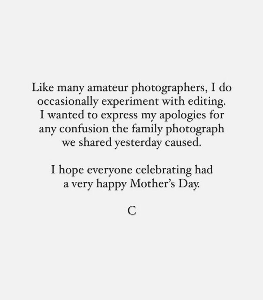 Ha scritto in una Instagram Story: “Come molti fotografi amatoriali, occasionalmente sperimento con l’editing. Volevo chiedere scusa per la confusione che la foto di famiglia condivisa ieri può aver causato”.