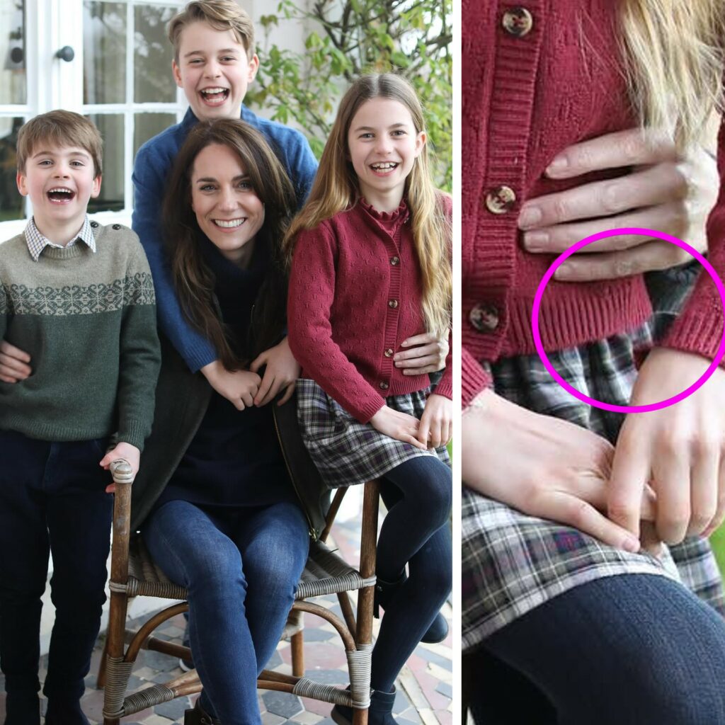 Nello scatto, il primo ufficiale a distanza di un paio di mesi dall’operazione, si vedono alcuni dettagli “fuori posto”, come la manica del cardigan di Charlotte (nell’immagine insieme ai fratelli George, 10 anni, e Louis, 5) che si dissolve nel nulla.