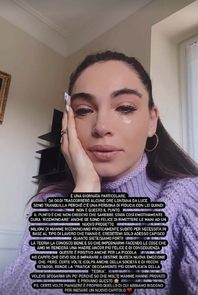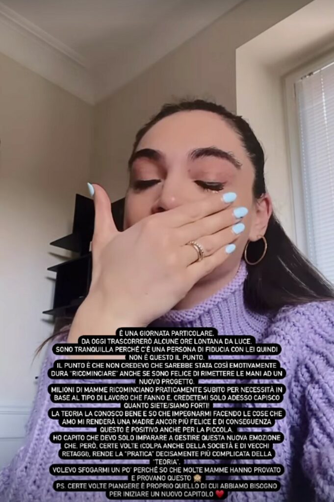 Staccarsi dalla bambina, con cui ha condiviso finora intere sue giornate, non è facile. Lorella è spaventata dal suo sentire e lo rivela senza filtri. "Da oggi trascorrerò alcune ore lontana da Luce - scrive in una storia in cui è affranta - Sono tranquilla perché c'è una persona di fiducia con lei, quindi non è questo il punto. Il punto è che non credevo che sarebbe stata così emotivamente dura 'ricominciare' anche se sono felice di rimettere le mani a un nuovo progetto”.
