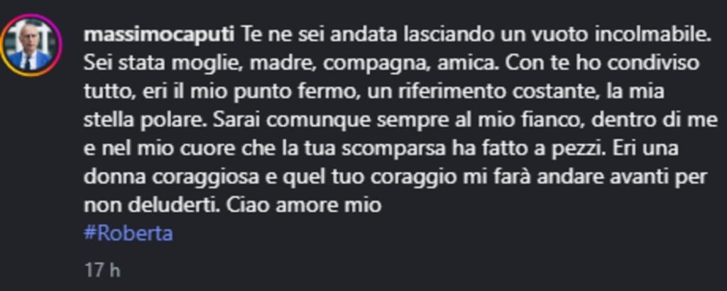 “Te ne sei andata lasciando un vuoto incolmabile - scrive Caputi - Sei stata moglie, madre, compagna, amica. Con te ho condiviso tutto, eri il mio punto fermo, un riferimento costante, la mia stella polare. Sarai comunque sempre al mio fianco, dentro di me e nel mio cuore che la tua scomparsa ha fatto a pezzi. Eri una donna coraggiosa e quel tuo coraggio mi farà andare avanti per non deluderti. Ciao amore mio Roberta”.