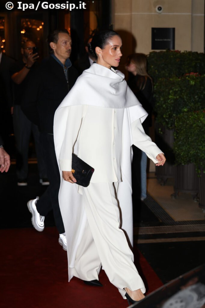 Meghan Markle ha fatto il suo debutto ufficiale alla Paris Fashion Week, partecipando sabato 4 ottobre alla sfilata di Balenciaga. La Duchessa di Sussex, 44 anni, è apparsa con un look minimalista e sofisticato: un’ampia cappa bianca sopra una camicia dello stesso tono, abbinata a décolleté nere a punta e un raccolto liscio e ordinato.