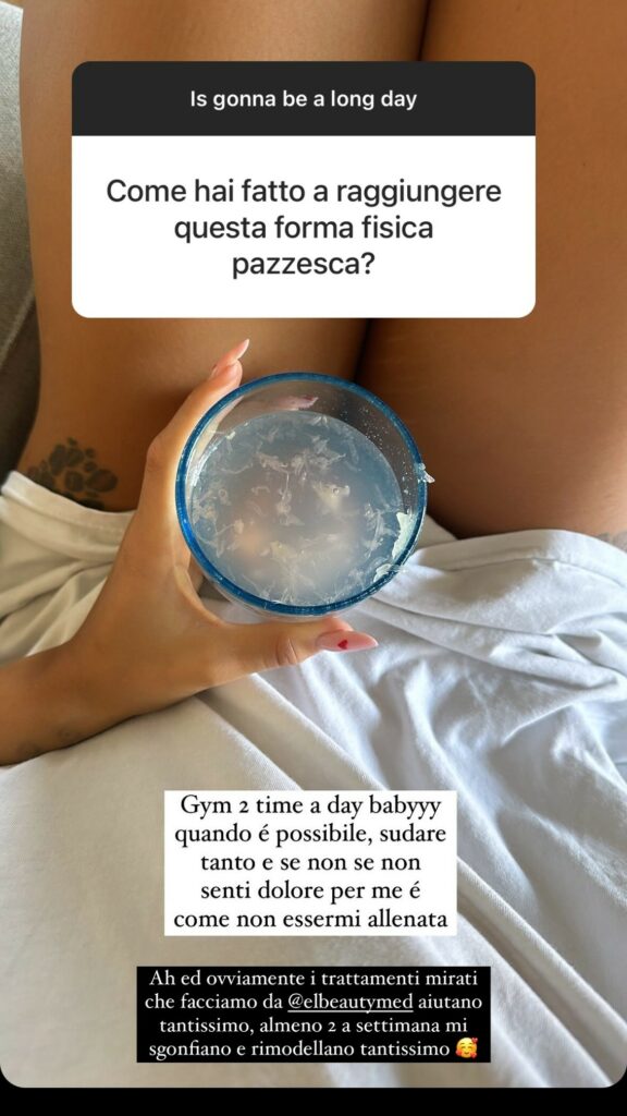 Quando le è stato chiesto sul social come faccia ad essere tanto tonica, ha risposto: “Gym due volte al giorno baby quando è possibile, sudare tanto, e se non senti dolore per me è come non essermi allenata”.