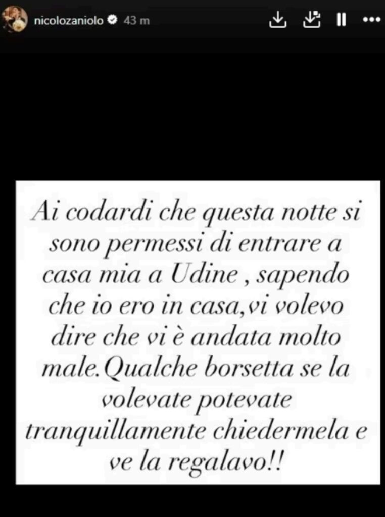 “Ai codardi che questa notte si sono permessi di entrare a casa mia a Udine, sapendo che non ero in casa, vi volevo dire che vi è andata molto male - sbotta Zaniolo nel suo post -. Qualche borsetta se la volevate potevate tranquillamente chiedermela. Ve l'avrei regalata. Io non ero in casa, magari ci fossi stato”.