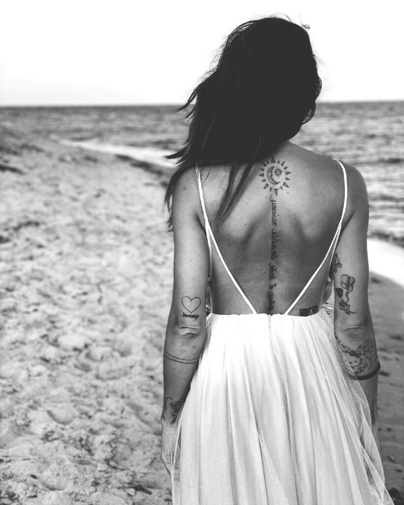 Ha foglie di ginkgo biloba sulla schiena, anche una scritta, “Smile”. “Il sorriso non deve mai mancare nella vita”, sottolinea Pamela. Ha scelto pure di farsi incidere sulla pelle una strofa de La Vispa Teresa: “Era la filastrocca che, da bambina, mi cantava mia nonna per farmi addormentare”. Sulle braccia ha moltissimi altri disegni. Non è ancora stanca né pentita di aver fatto i tattoo.