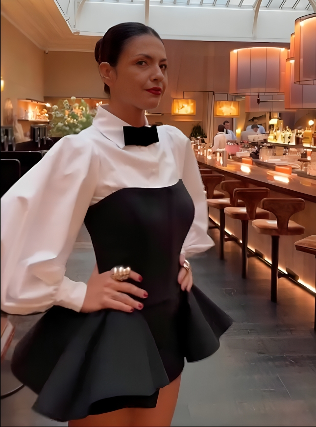 In passerella ha cambiato più di un look. Quello più apprezzato l’ha vista sfoggiare le sue gambe lunghissime. Una rivisitazione moderna “black and white” dell’eleganza classica: un body nero senza spalline con un vivace peplo, abbinato a maniche bianche ampie e scenografiche e a un raffinato fiocco. Infine delicati tacchi e anelli d’impatto.