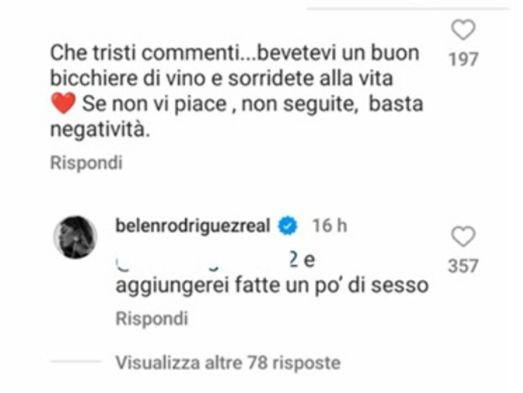 Tra chi la segue, c’è chi la difende a spada tratta. “Che tristi commenti…bevetevi un buon bicchiere di vino e sorridete alla vita. Se non vi piace, non seguite, basta negatività”, sottolinea una donna. Belen legge e precisa: “Aggiungerei fate un po’ di sesso”. La 39enne si lascia scivolare tutto addosso.