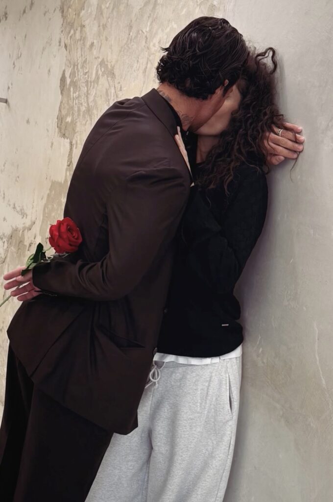 Lui, che ha circa quattro anni meno di lei, la bacia tenendo dietro le mani una rosa rossa, simbolo del suo amore per la mora riccioluta.