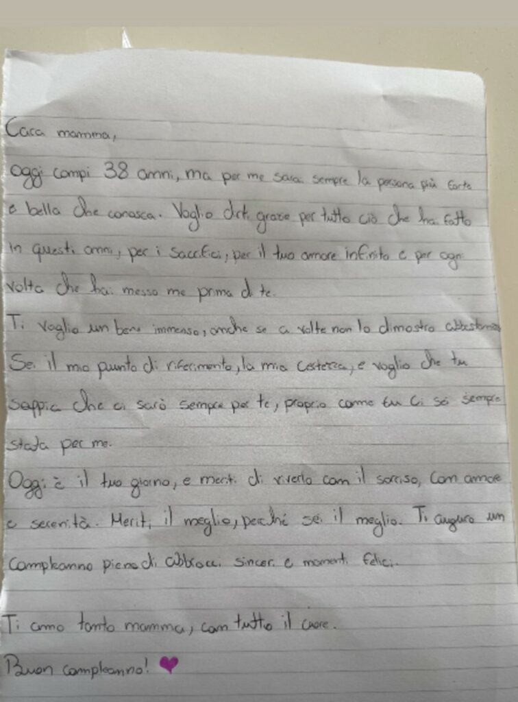 Per il giorno speciale della madre, Pia, 13 anni, fa trovare a Raffaella una lettera. “Cara mamma, oggi compi 38 anni, ma per me sarai sempre la persona più bella che conosca - scrive la ragazzina - Voglio dirti grazie per tutto ciò che hai fatto in questi anni, per i sacrifici, per il tuo amore infinito e per ogni volta che hai messo me prima di te”.
