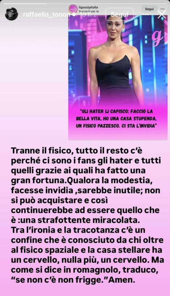 Tonon è inorridito dalle affermazioni dell'artista, e così nelle sue Storie sbotta e scrive: “Tranne il fisico, tutto il resto c'è perché ci sono i fan, gli hater e tutti quelli grazie ai quali ha fatto una gran fortuna. Qualora la modestia, facesse invidia, sarebbe inutile; non si può acquistare e così continuerebbe ad essere quello che è: una strafottente miracolata”. Raffaello conclude: “Tra l'ironia e la tracotanza c'è un confine che è conosciuto da chi oltre al fisico spaziale e la casa stellare ha un cervello, nulla più, un cervello. Ma come si dice in romagnolo, traduco, ‘se non c'è non frigge’”. Chissà se la Rodriguez replicherà…