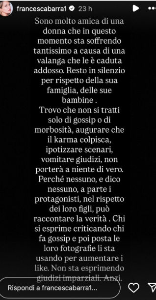 Francesca attacca chi ha reso pubblici messaggi privati: “E dirò di più a chi invoca la privacy. Vale per tutti: chi ci è antipatico, chi odiamo, chi detestiamo, chi ci 'serve' (che brutto termine ma serve a dare il senso). Non possono circolare in chat messaggi, foto e video, prese in giro, diffamazioni, richieste di gettare fango su chi vogliamo far 'sparire mediaticamente' e poi invocare un buon giornalismo. Lo dico qui e vale per tutti. Coerenza. Se vogliamo un mondo più giusto e corretto iniziamo a esserlo”.