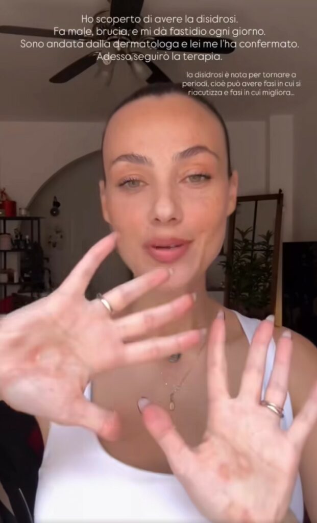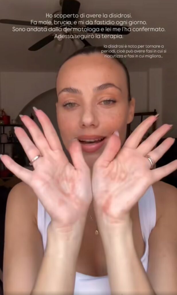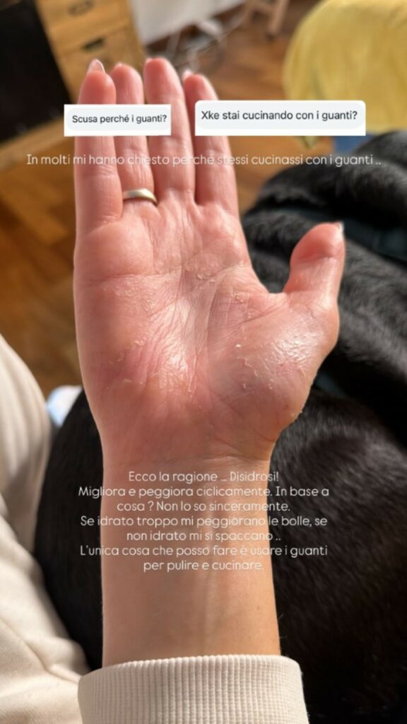 I follower le domandano in continuazione: “Scusa perché i guanti?”. E ancora: “Perché stai cucinando con i guanti?”. L’ex gieffina vip, influencer e attrice, mostra la mano che ha l’epidermide secca e spellata, arrossata, con alcune bollicine. “In molti mi hanno chiesto perché stessi cucinando con i guanti. Ecco la ragione… Disidrosi! Migliora e peggiora ciclicamente. In base a cosa? Non lo so sinceramente. Se idrato troppo mi peggiorano le bolle, se non idrato, mi si spaccano. L’unica cosa che posso fare è usare i guanti per pulire e cucinare”, fa sapere.