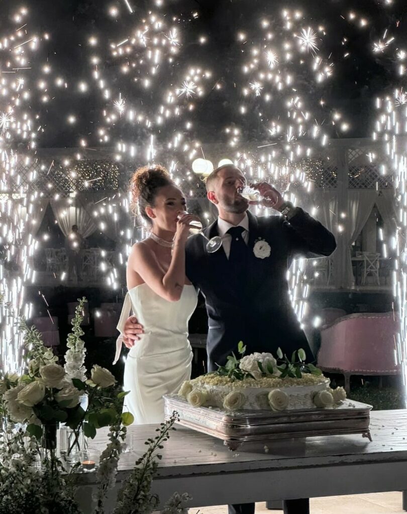 Nella location immersa nel verde, l’allestimento è stato perfetto e curatissimo: tanti fiori e rose bianche. Gli sposi hanno pronunciato il sì davanti ad amici e parenti, la sposa è stata accompagnata all’altare dal padre. Poi il ricevimento, andato avanti per tutta la giornata fino a sera: brindisi, canti, danze scatenate e il taglio della torta.