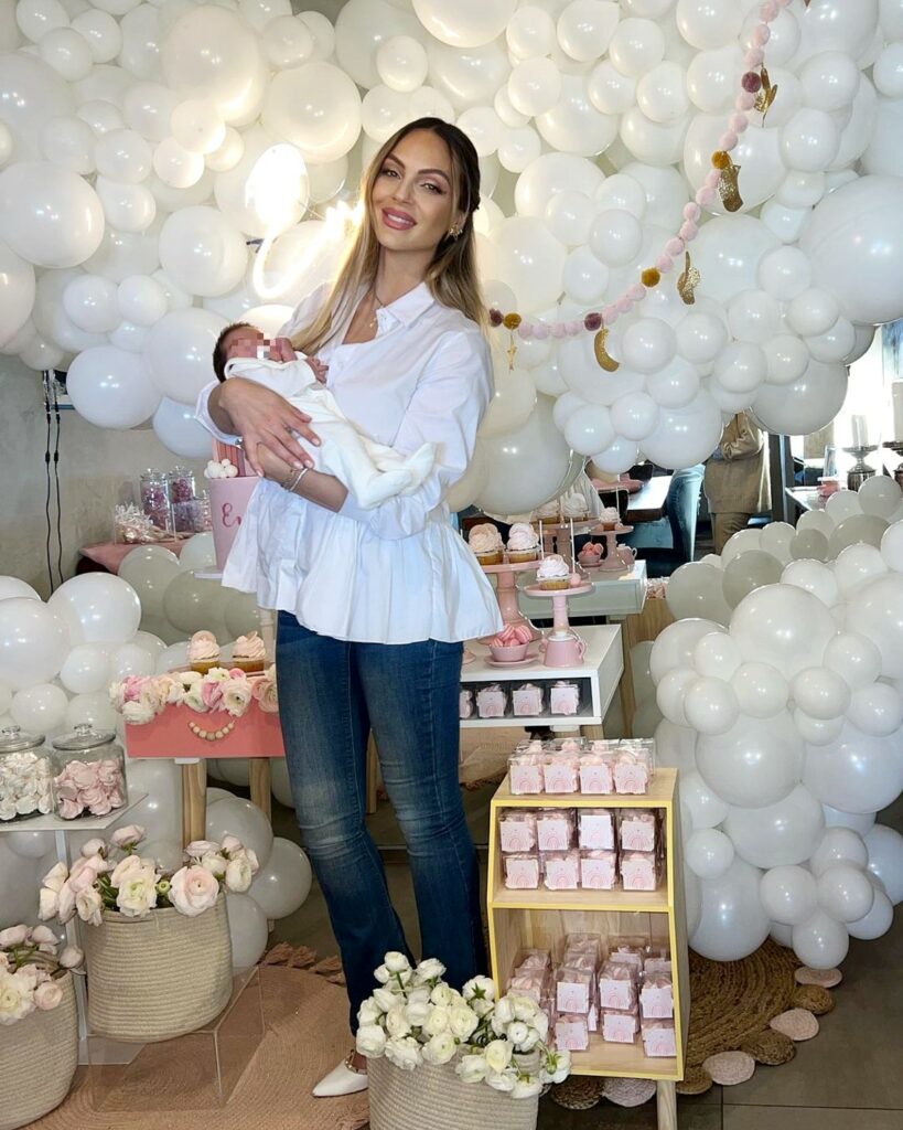 Sarah per la bimba ha voluto un party tutto nei toni del rosa, con cup cake, dolcetti, piccoli regalini per gli ospiti e una torta con su scritto il nome della piccola. Dietro un allestimento con miriade di palloncini bianchi. Love Events ha curato i dettagli della festa, arricchita anche da tante rose color chiaro. Evah è una piccola principessa tra le braccia di una madre che si perde negli occhi della sua ‘cucciola’.
